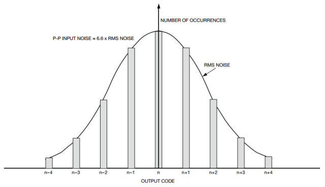 码字分布一般为高斯分布。均方根噪声是通过从该直方图产生的曲线计算出的,曲线的宽度决定均方根噪声。高斯曲线的分布是从负无穷大到正无穷大。然而,99.99%的码字出现在6.6倍均方根噪声范围内。因此,峰峰值噪声为均方根噪声的6.6倍。